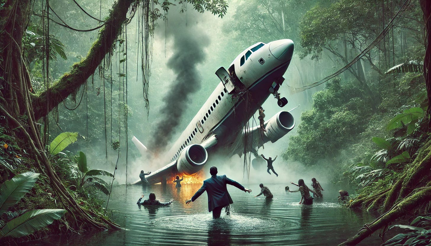 Smoke filled the cabin. The businessman’s ears rang. His vision blurred as he looked around. The plane had come to a stop, tilted slightly to one side, half-submerged in murky water. Lush green surrounded them—trees, vines, the dense canopy of a swamp.